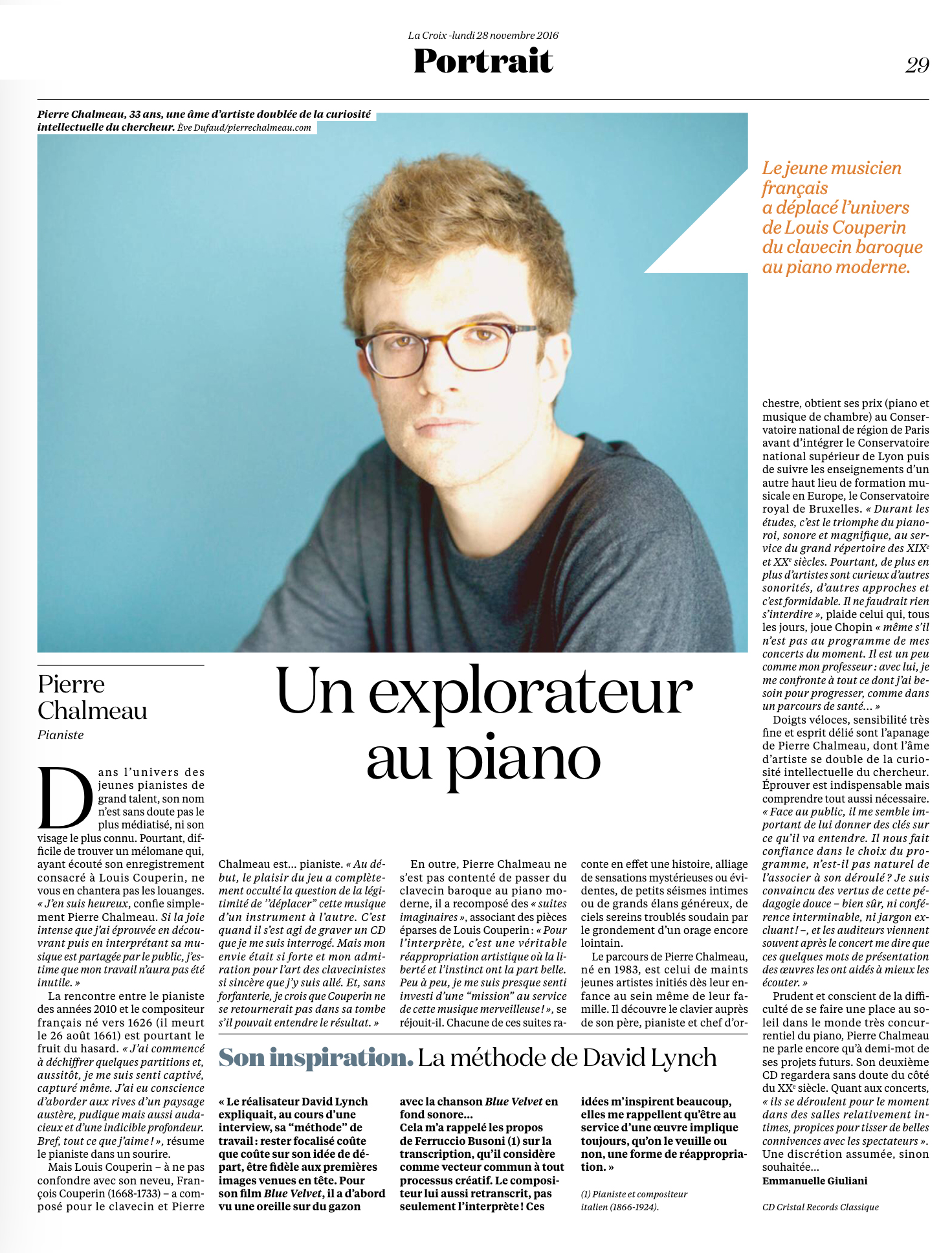 « Un explorateur au piano » Journal La Croix, Portrait par Emmanuelle Giuliani